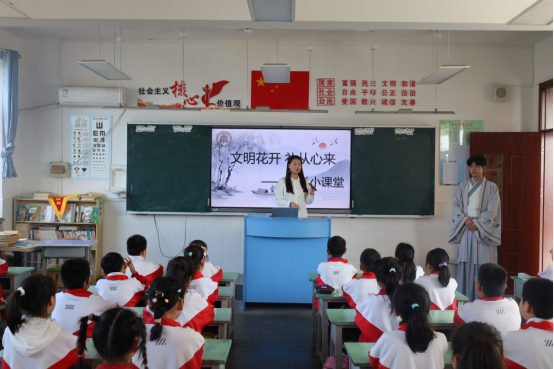 9月24日下午,曲阜师范大学携手曲阜市民族小学开展中华优秀传统文化进校园活动。曲阜市委统战部,曲阜师范大学党委统战部、美术与书法学院出席活动。活动现场,来自历史文化学院“国学小课堂”服务队的张韵阁、王柳、陈丽颖3位同学,以“礼”为核心主题,为民族小学三年级学生带来了一堂生动有趣的传统文化课,引导孩子们在互动中感受中华礼仪之美。来自美术与书法学院的高润之、赵启帆、孙萌泽、王嘉怡4位同学,为四年级学生开启了书法认知启蒙之旅。同学们听得认真、练得专注,在一笔一划的书写中,初步体会到书法艺术的独特魅力,激发了对传统书法文化的浓厚兴趣。最后,书写“做最好的自己”“共同团结奋斗、共同繁荣发展”“爱我中华”“中华民族一家亲、同心共筑中国梦”等民族团结美好祝福,进一步增进了民族团结之情。